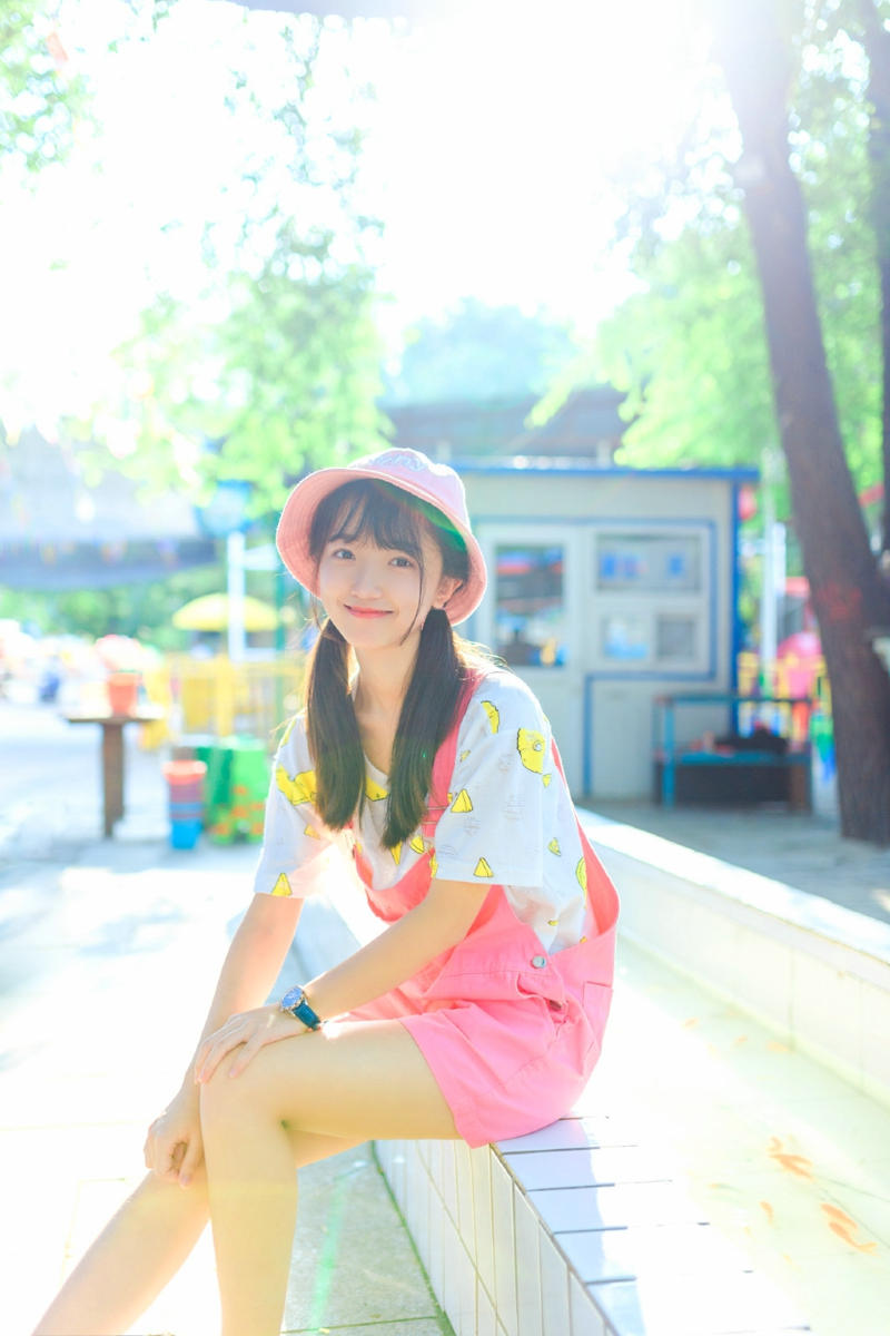 游乐园内的粉红背带裙妹子清纯可人