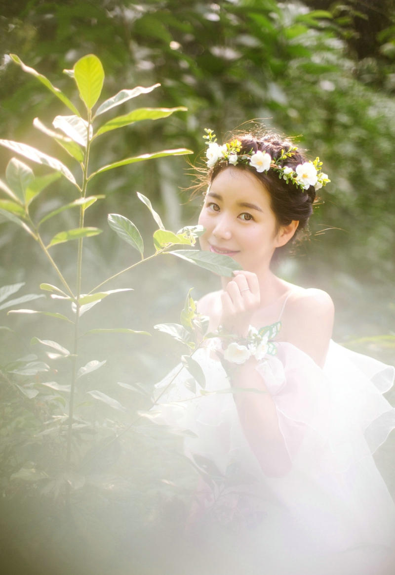 森林内的花环白裙女神香肩迷人写真