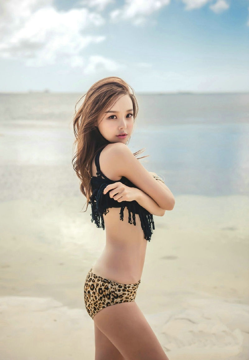 沙滩豹纹比基尼美模火辣狂野掀衣露肚脐-套图吧