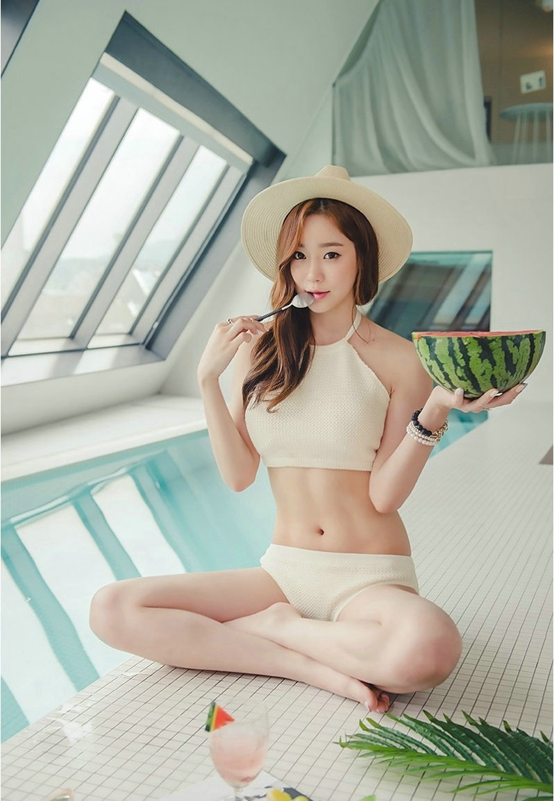 室内泳池馆的吃瓜模特盘腿而坐-套图吧
