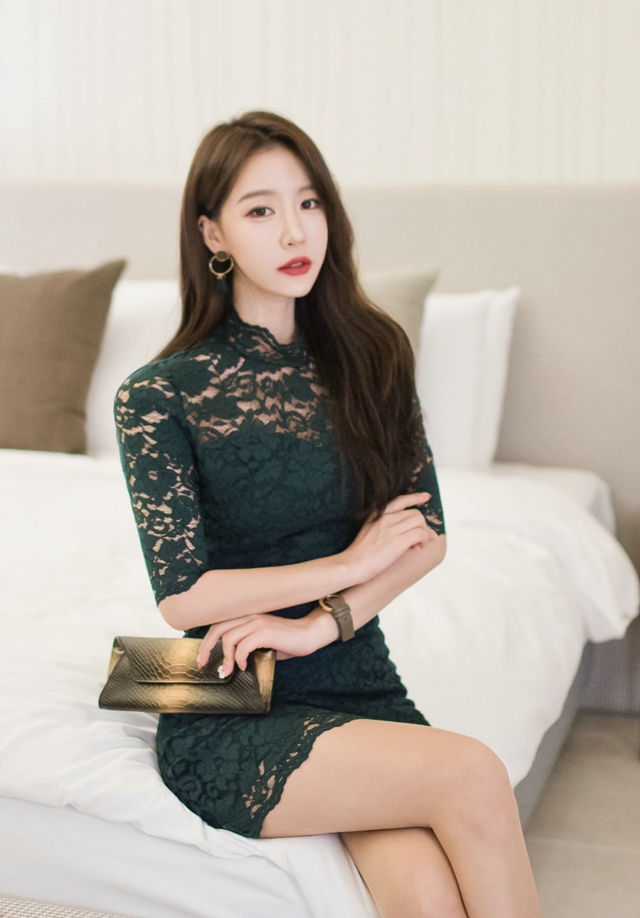 酒店内的忧郁美模墨绿蕾丝裙美丽动人-套图吧
