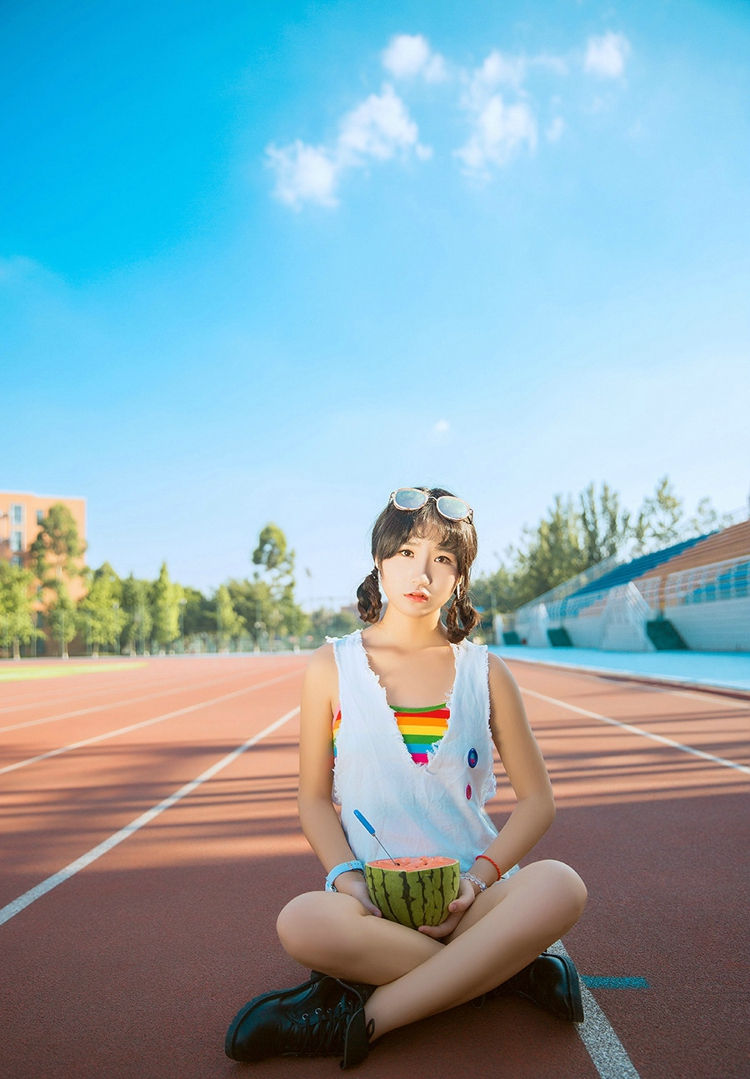 体育场上的吃瓜少女活泼跳跃笑容迷人-套图吧