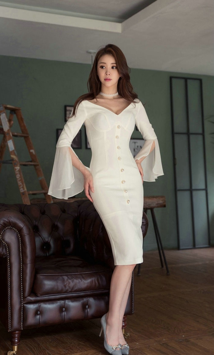 喇叭袖v领裙模特胸前隐约现美乳勾人魂魄