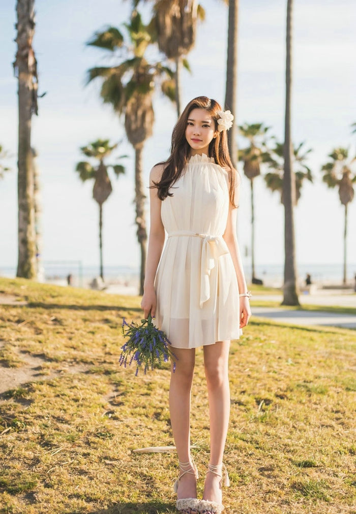 晴天花园内的捧花美模洁白纱裙柔美动人-套图吧