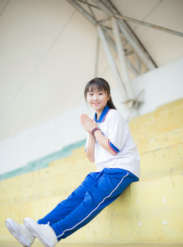 跑道上盘腿而坐校服女孩享受校园美好时光-套图吧