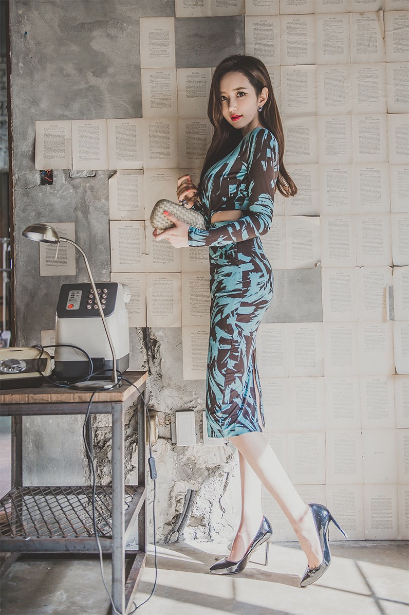 阳光照耀下明媚美模蓝裙亮眼秀小蛮腰