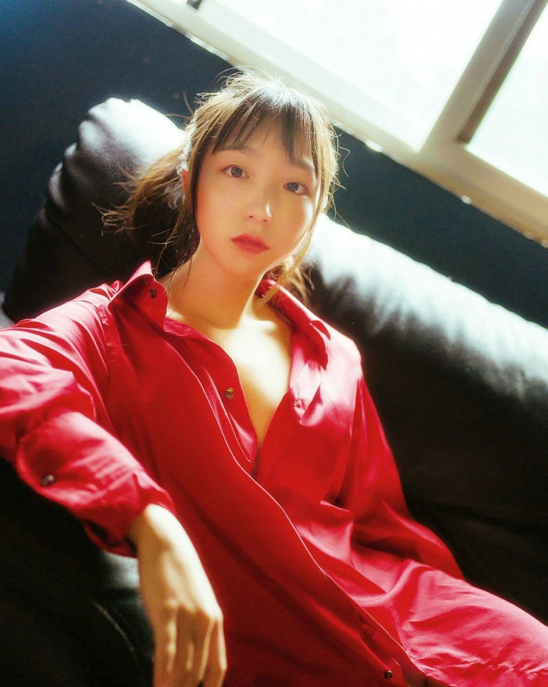 昏暗私房灯光下的红色衬衫马尾少女娇美可人-套图吧
