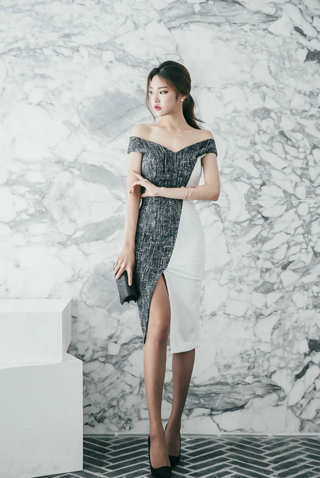 窗帘美模裸肩拼接裙目光呆滞楚楚可人