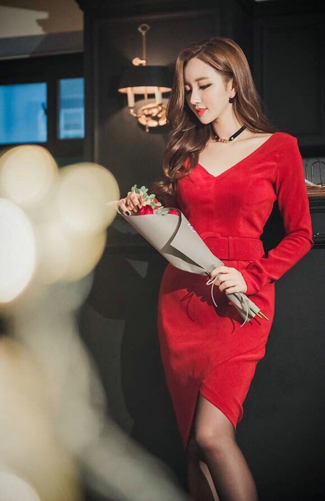 朦胧灯光下的捧花美模鲜艳红裙靓丽动人-套图吧