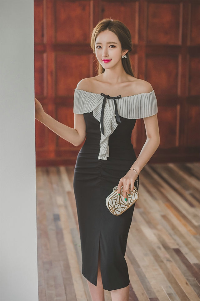 倚靠扶梯美模一字肩裙小秀锁骨身材比例完美-套图吧