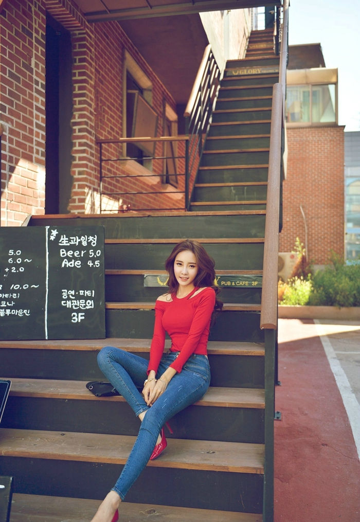 户外台阶上的拽酷模特嘟嘴俏皮爱咬手-套图吧