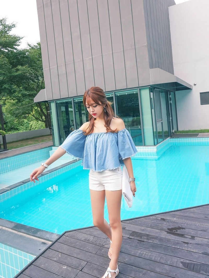户外泳池岸上的裸肩嫩模娇羞可爱-套图吧