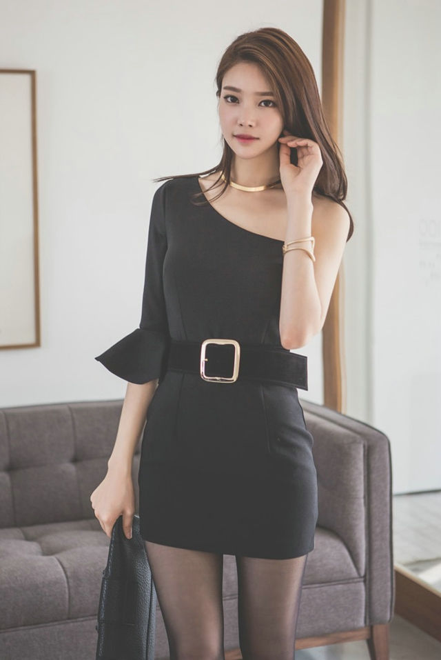 高冷美模斜肩裙喇叭袖美模黑色诱惑-套图吧