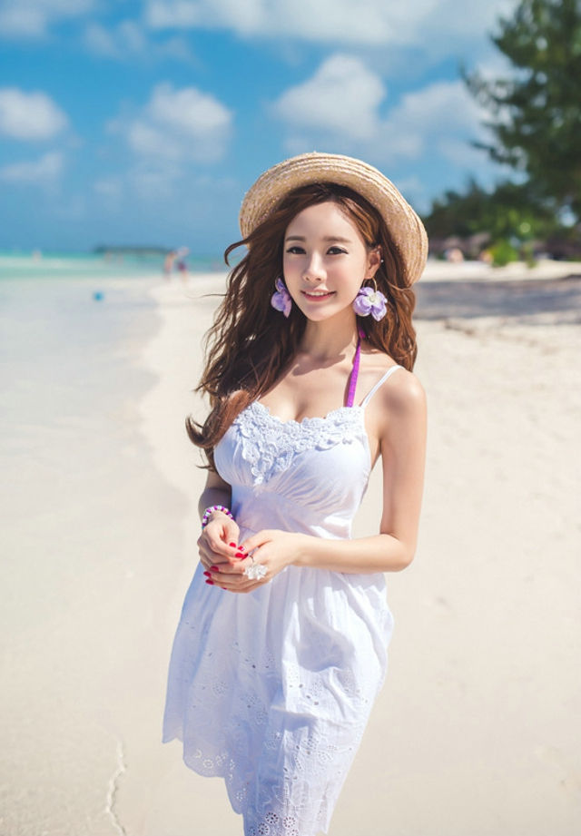 海边草帽嫩模连衣裙清新靓丽楚楚可人