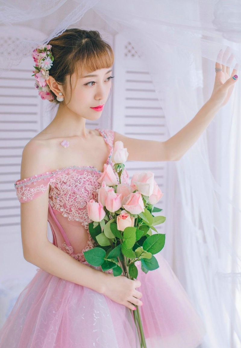 盘发一字肩礼裙美女花束甜美写真-套图吧