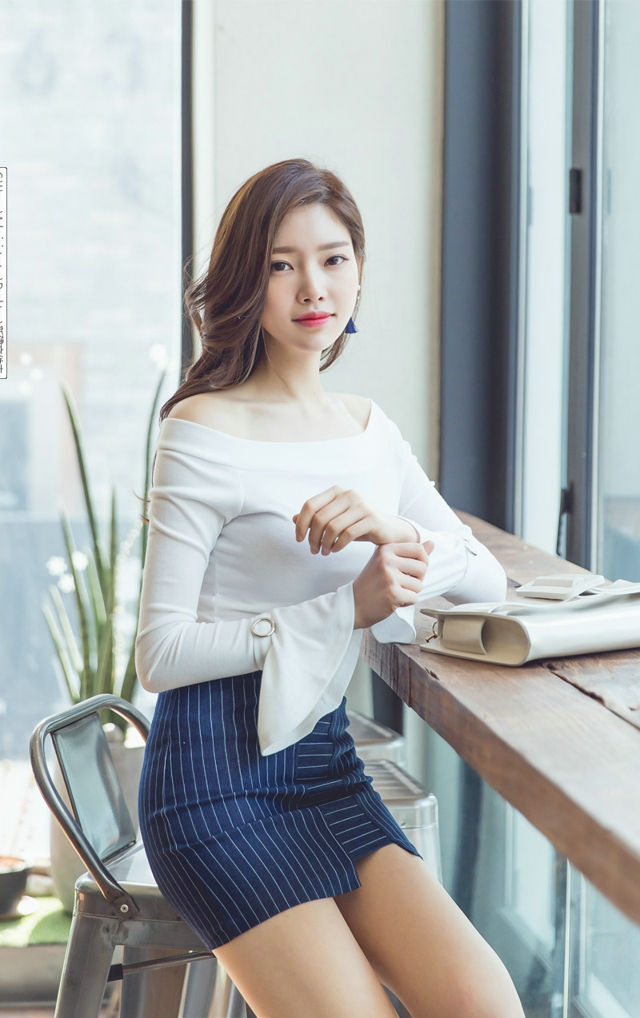 裸肩喇叭袖美模餐馆内休闲东张西望-套图吧