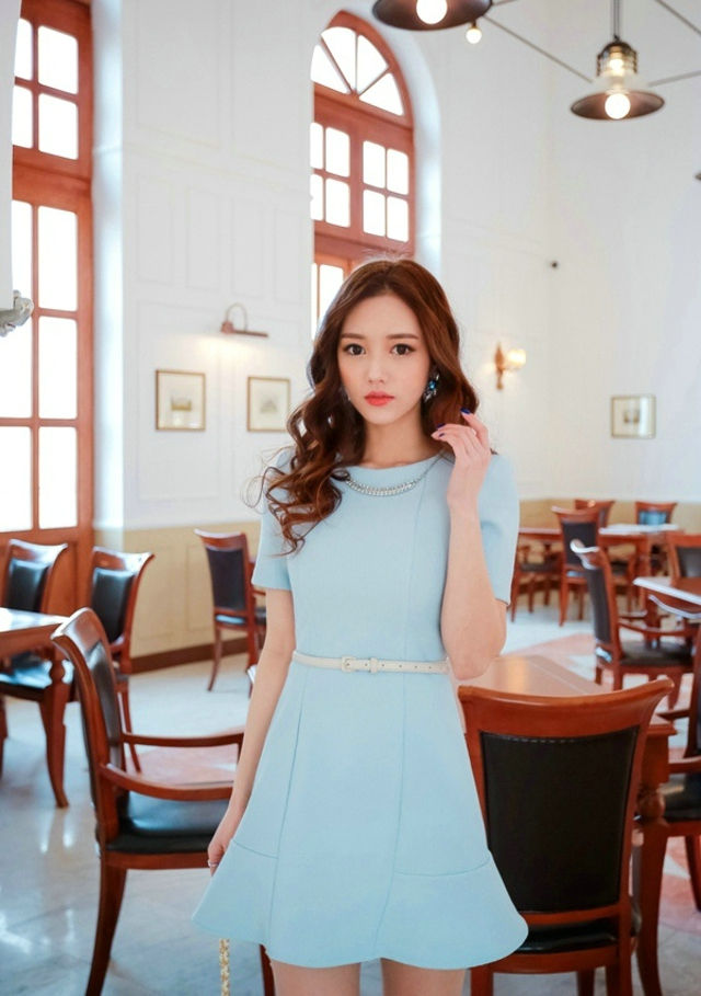 波浪美女模特腰带配蓝裙甜美可爱-套图吧