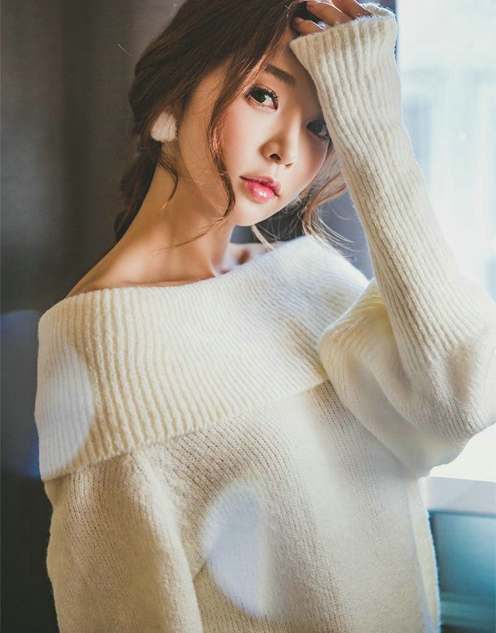 裸肩毛衣美模倚靠椅子知性大方展秋日暖意