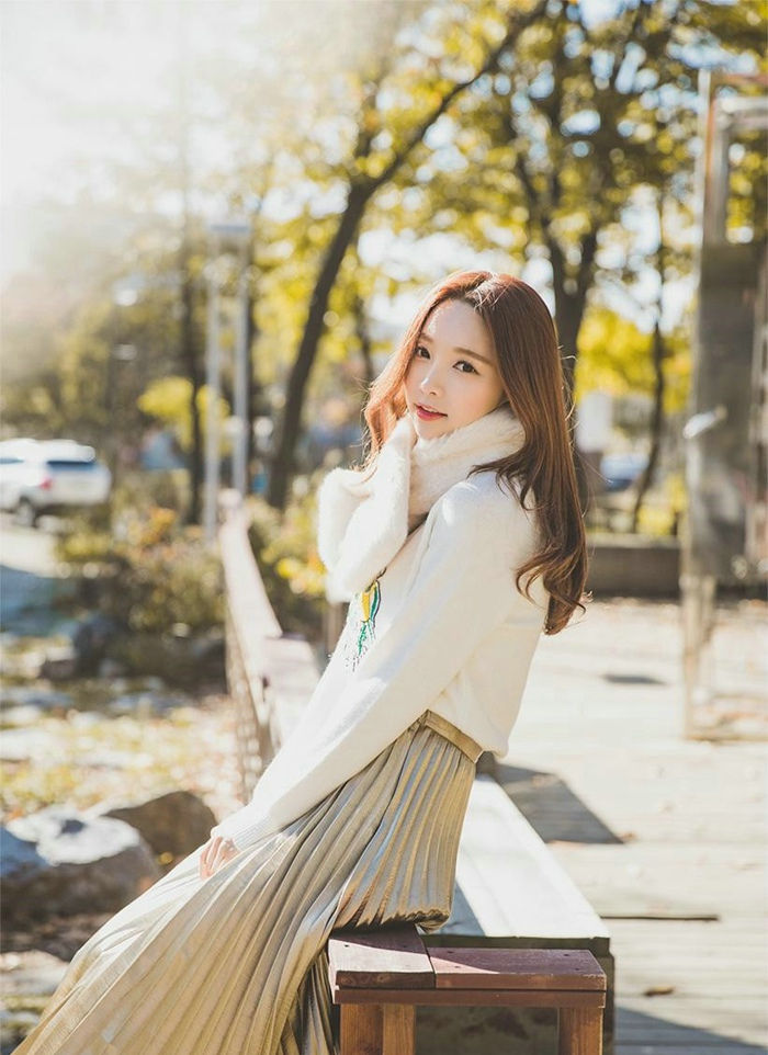 冬日阳光下围脖美模百褶裙露灿笑甜美-套图吧