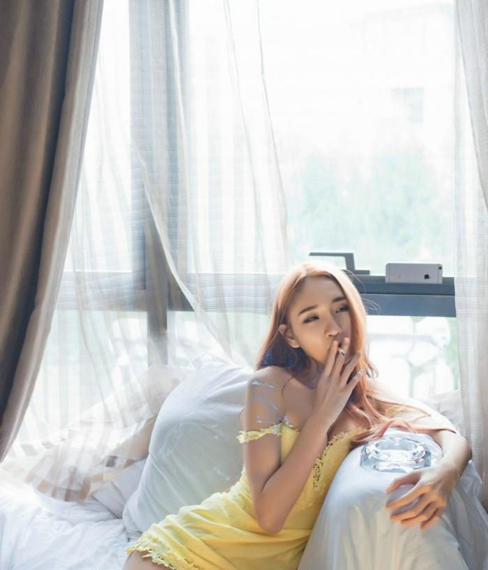 素颜美女黄色吊带睡衣风情万种性感私房写真