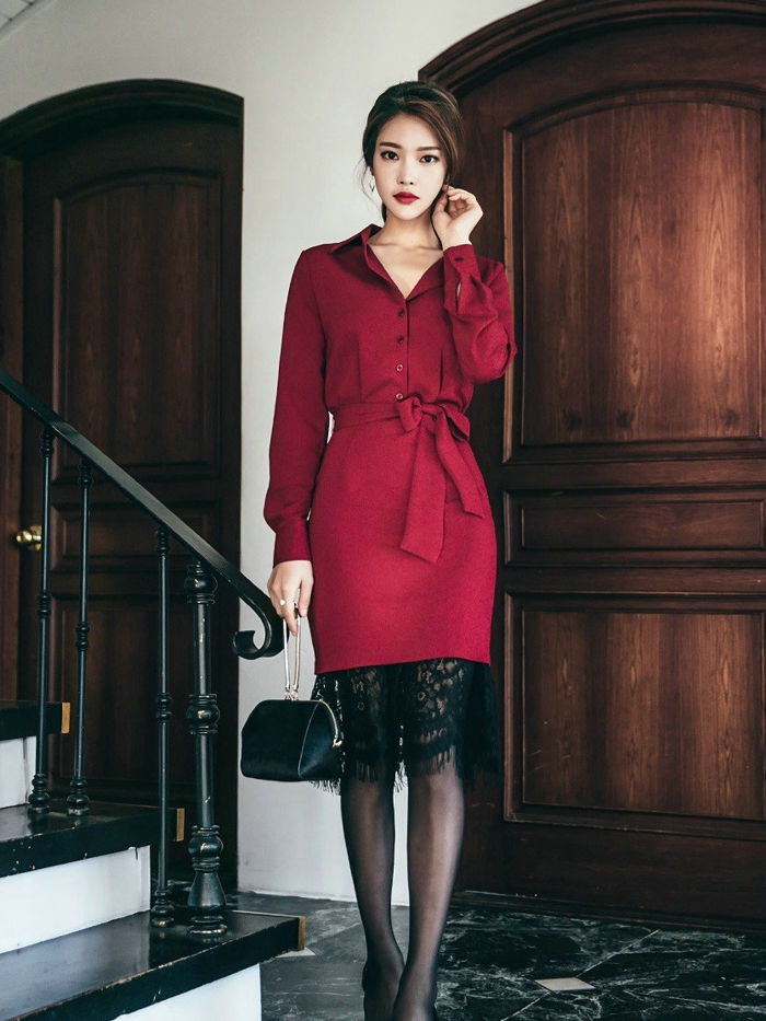 楼梯系耳环美模蕾丝裙搭鲜艳外套端庄优雅-套图吧