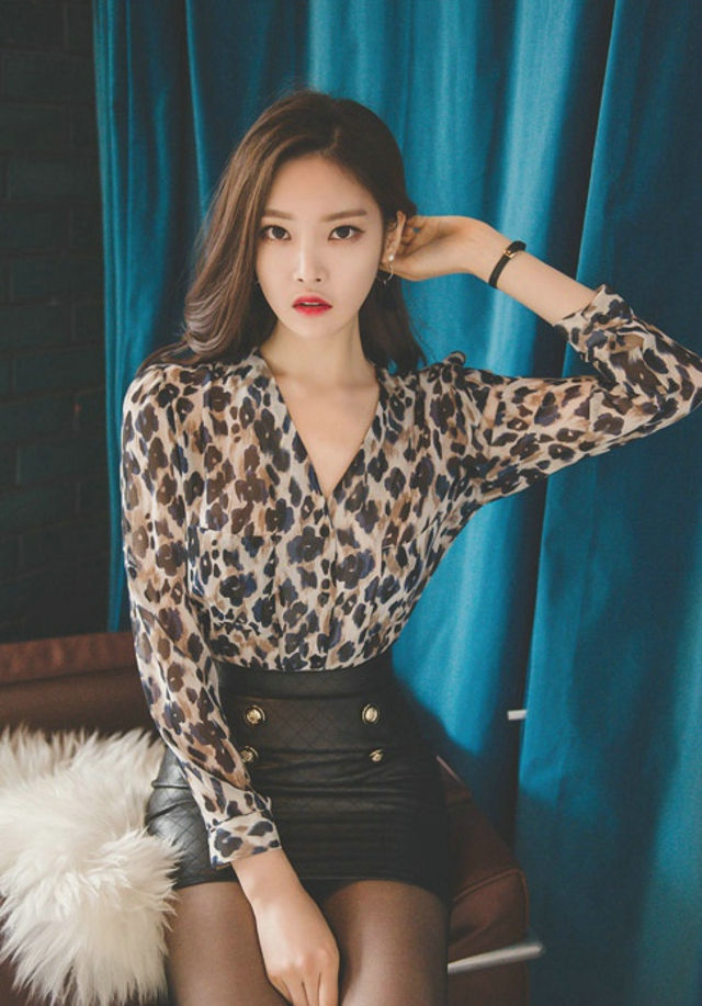 豹纹超短包臀裙美模皮肤白皙霸气外露