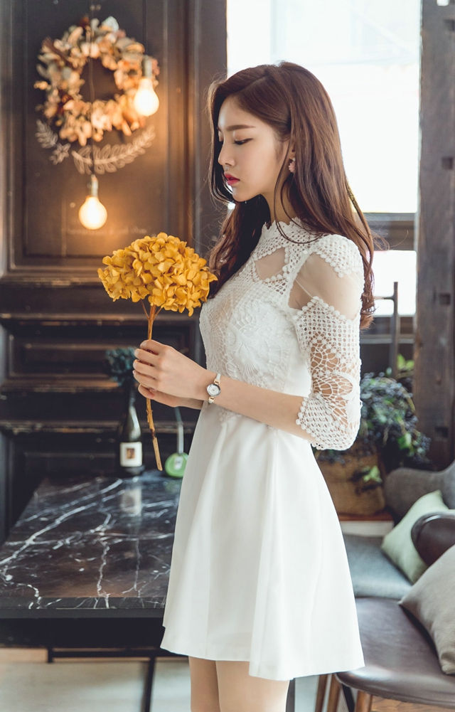 纯白蕾丝连衣裙美模甜美纤细美腿-套图吧