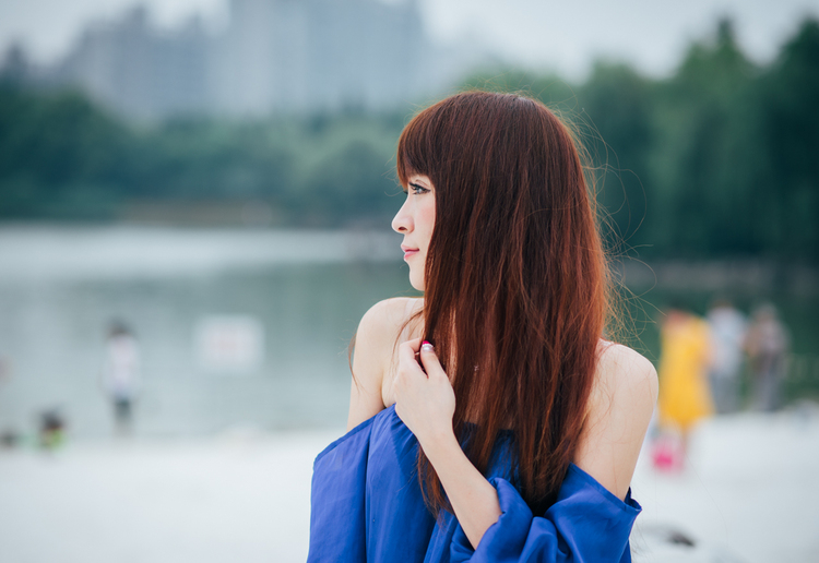 白色沙滩上的性感可爱蓝裙女孩-套图吧