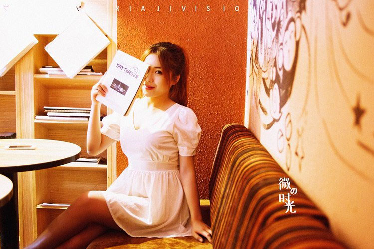 休闲咖啡厅里的可爱白裙少女-套图吧