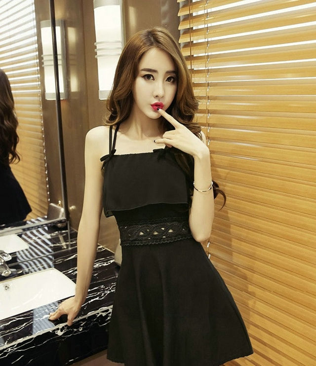 卫生间嘟嘴模特吊带镂空连衣裙肤白貌美气质佳-套图吧