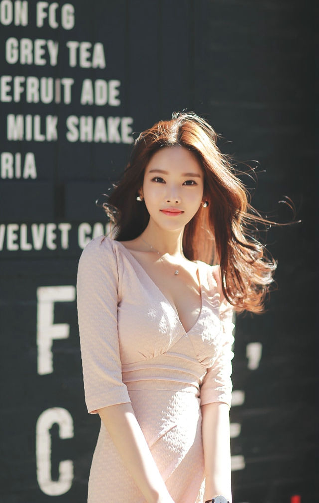 阳光下街头秀发飘逸美模粉嫩裙显简约知性-套图吧