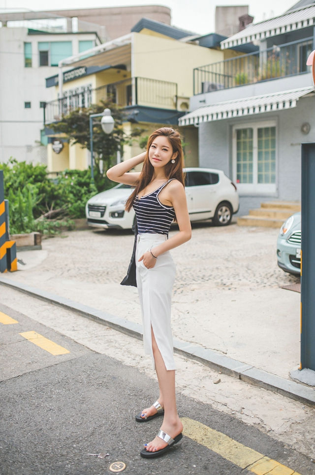 街头美模条纹背心裤装领口微露雪肤-套图吧
