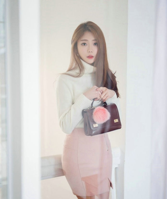 楼梯美女模特高领毛衣粉嫩半身裙温暖有型-套图吧
