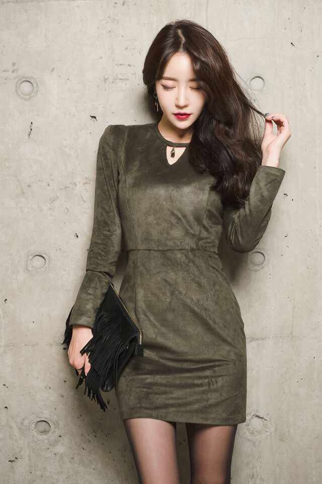 墨绿裙美女模特展诗意典雅撩发妩媚-套图吧