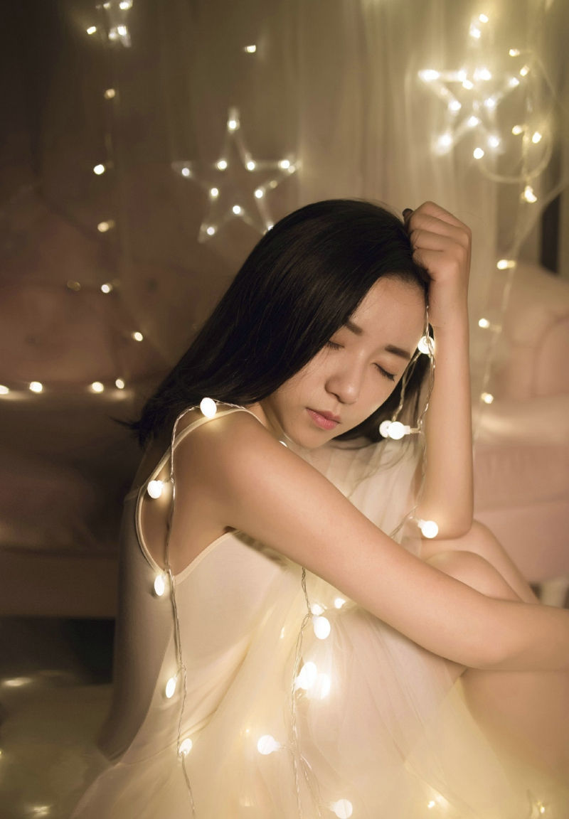 夜晚灯光中的白裙美女柔美吸睛写真