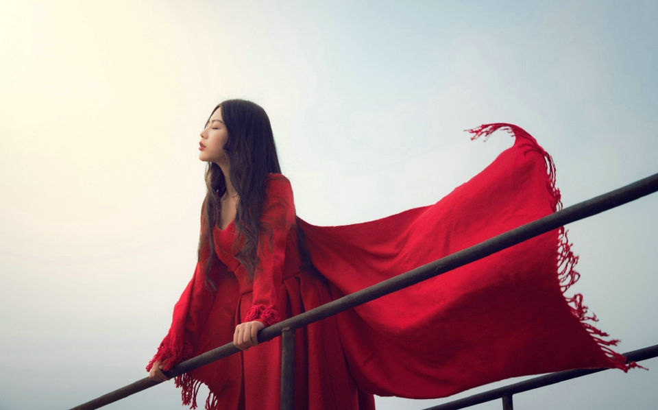 户外红裙艳丽美女中分黑发玫瑰花香