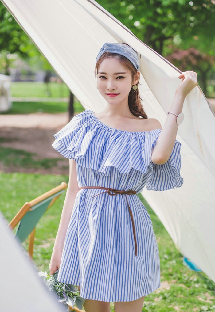 发箍美女模特斜肩条纹裙清丽可人-套图吧