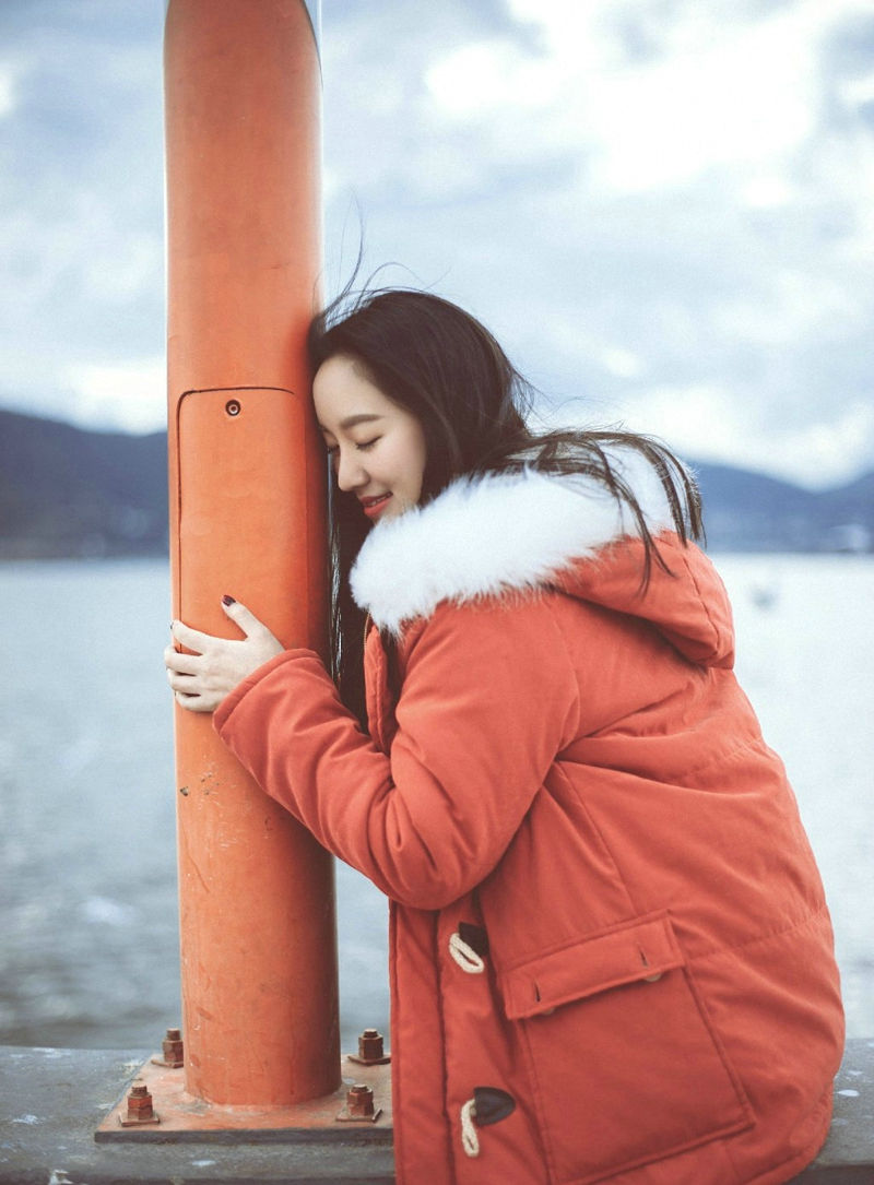 寒冷冬季海边与海鸥玩耍的长发飘飘美女温馨写真-套图吧