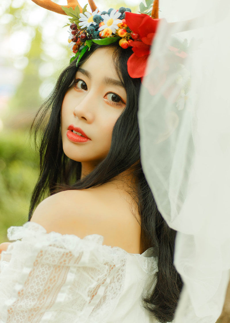 清纯美女野外麋鹿角白纱裙清新写真-套图吧