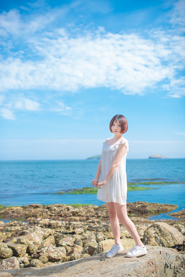 海边礁石上的短发美女白裙清新迷人