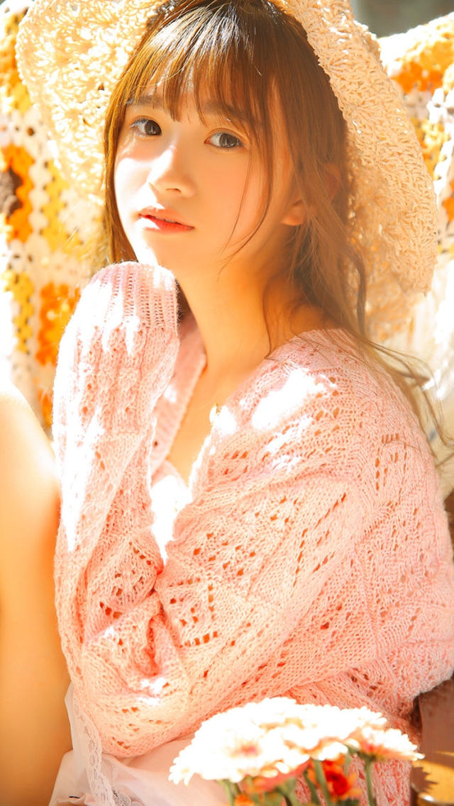 阳光下看书美女镂空粉色毛衣很温婉