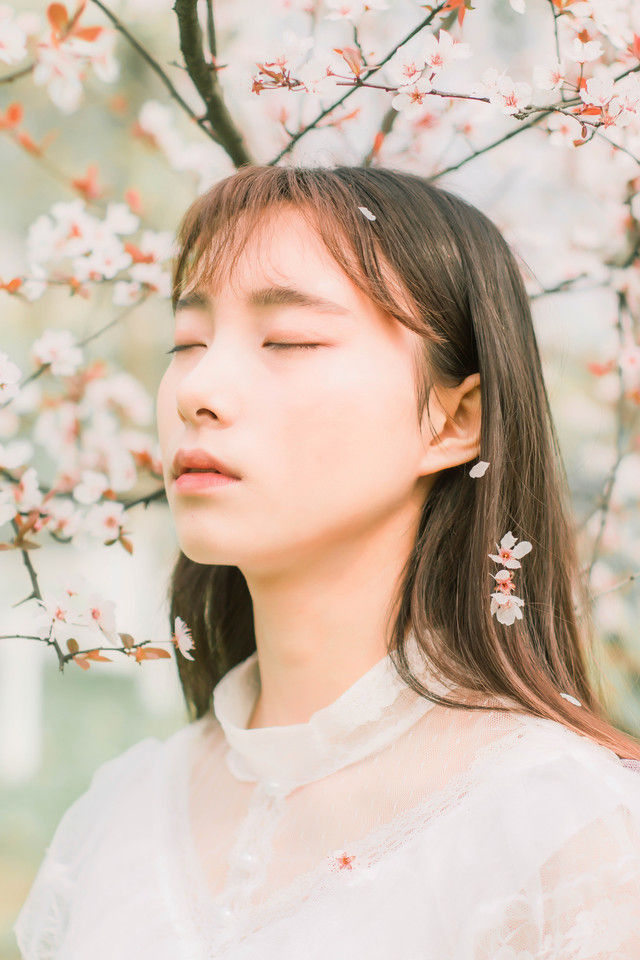 花树下爱摄影的长发妹子蕾丝长裙如花美貌