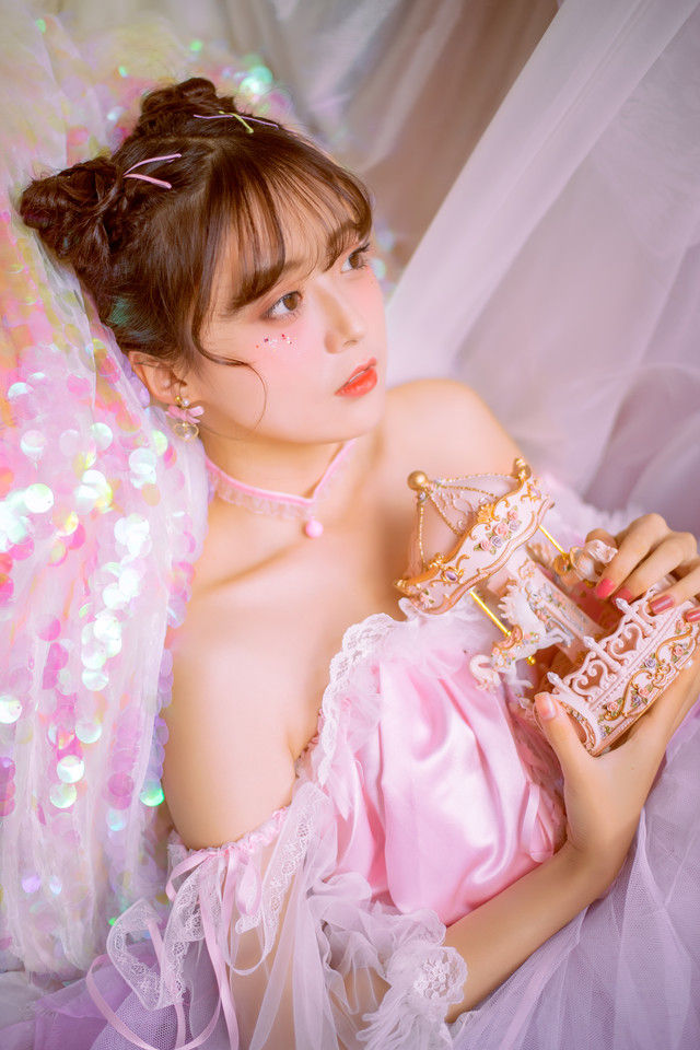 爱眨眼的粉红女孩裸肩白纱裙微笑迷人-套图吧