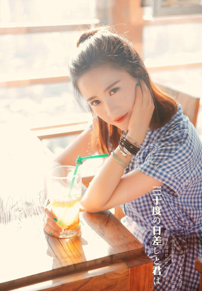 午后来杯甜甜的果汁吧清纯蓝色格子裙美女清新阳光俏皮唯美写真-套图吧