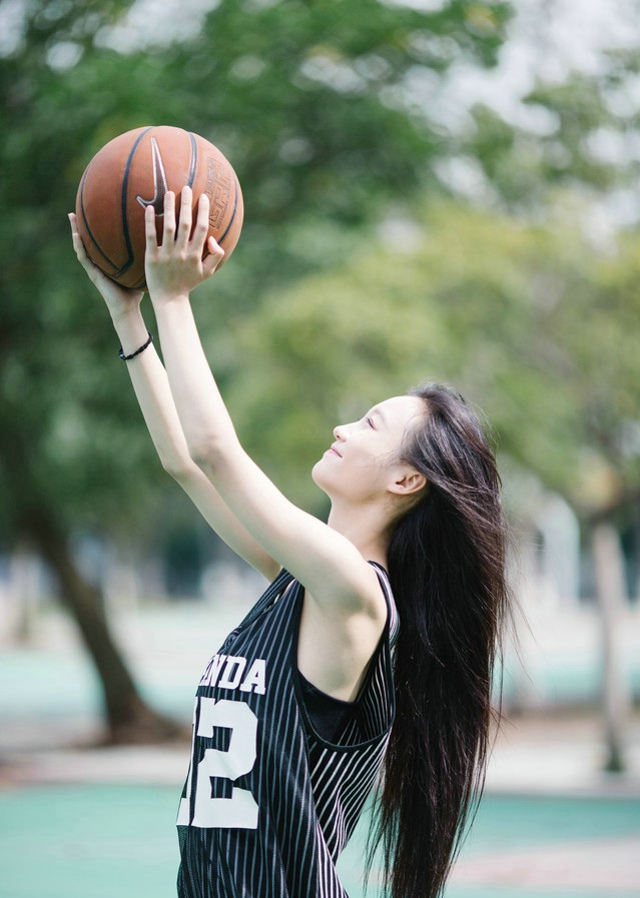 披头散发篮球少女投篮姿势精准梨涡甜笑-套图吧