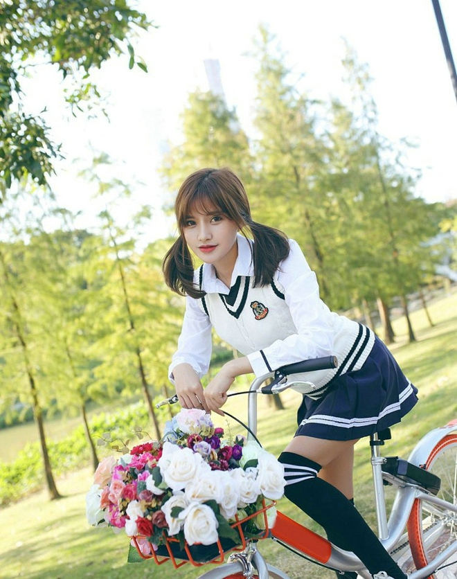 娇嫩清纯长腿女孩户外阳光单车俏皮唯美写真-套图吧