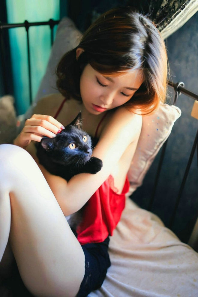 居家红衣清纯美女小猫温馨可爱俏皮写真-套图吧