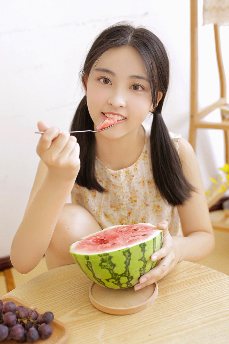 双马尾灵气女孩居家夏日清爽吃西瓜甜美迷人写真-套图吧